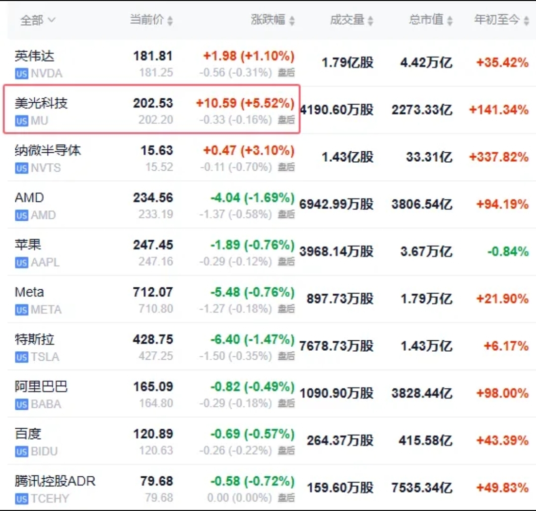 美光科技涨超5%,触及202美元创历史新高,公司获大摩大幅上调目标价至220美元。