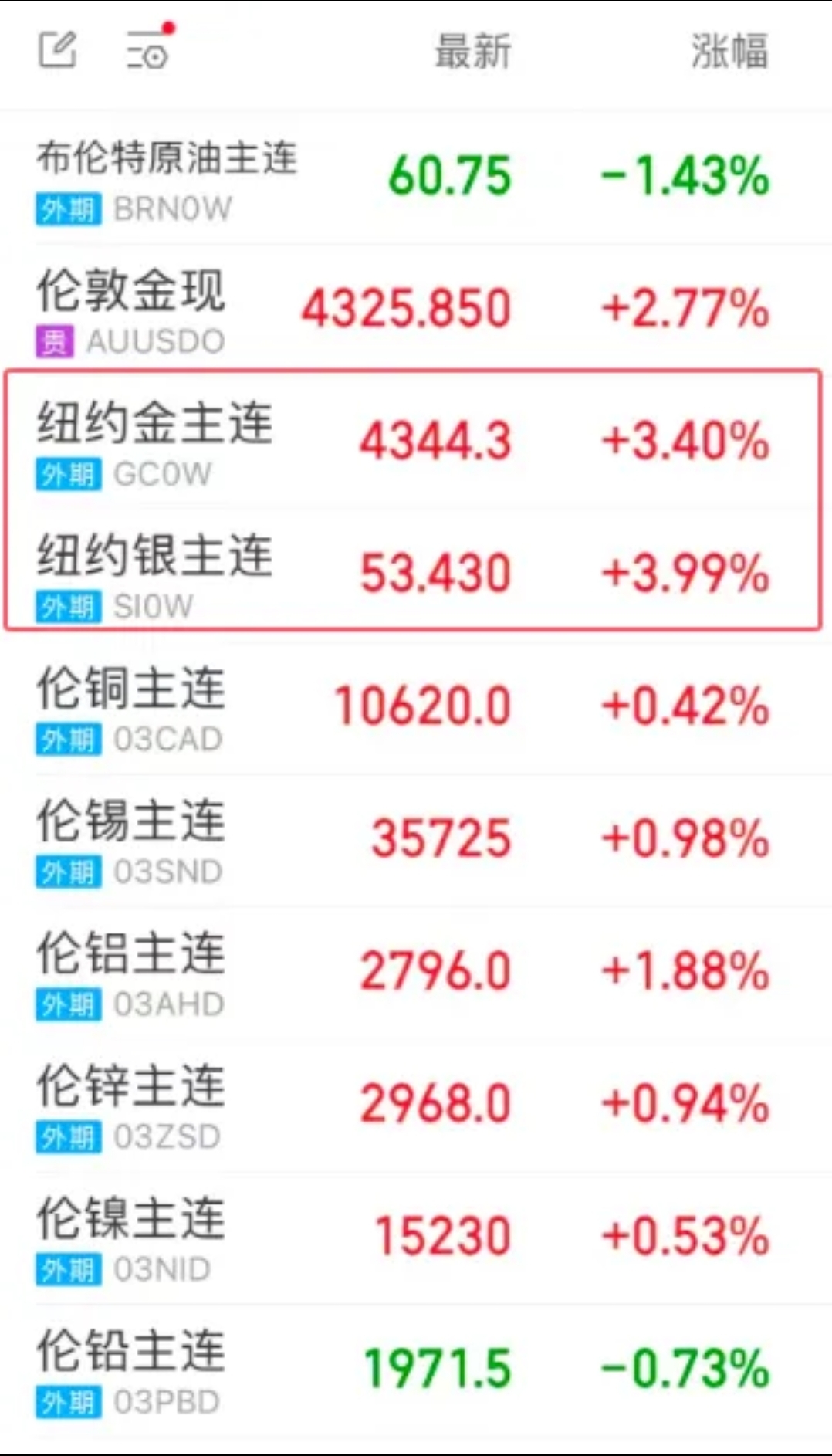 COMEX黄金期货收涨3.4%,报4344.3美元/盎司,COMEX白银期货收涨3.99%,报53.43美元/盎司,均再创收盘新高。