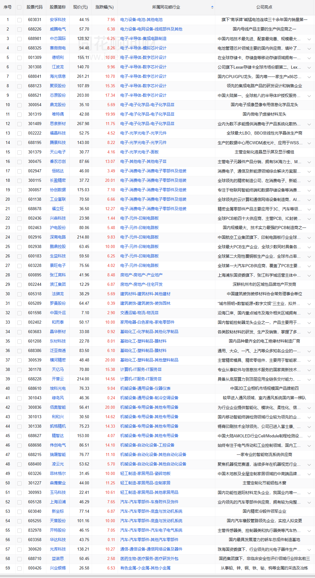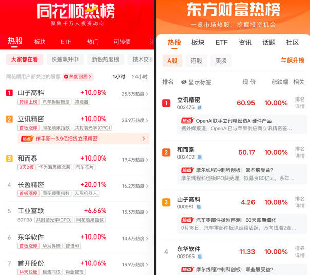 同花顺热榜:山子高科、立讯精密、和而泰、长盈精密、工业富联