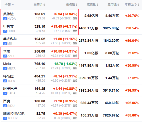 美股三大指数集体收涨,大型科技股多数上涨,甲骨文涨超6%,苹果涨超4%,英伟达涨近4%收创记录新高。