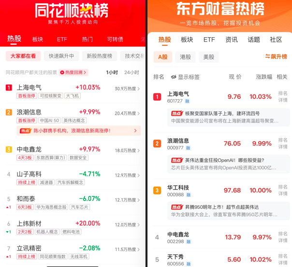 同花顺热榜:上海电气、浪潮信息、中电鑫龙、山子高科、和而泰
