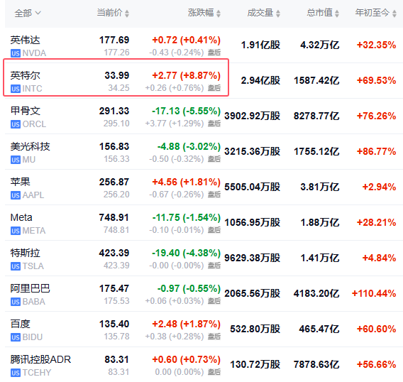 美股三大指数集体收跌,稀土概念、贵金属涨幅居前。英特尔涨幅8%,公司已就投资或制造合作事宜接洽了苹果和台积电等公司。